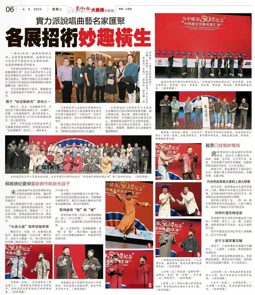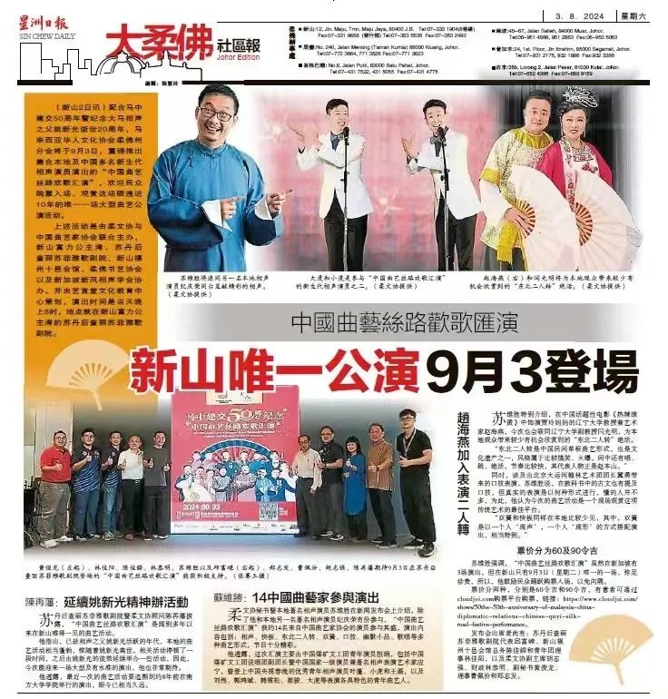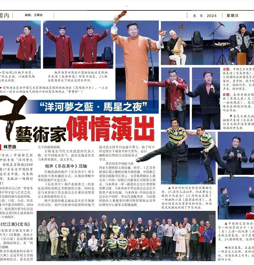 在新加坡期間,應寧等9人于黃金劇院參加“2024中新曲藝精品匯演”,攜手“二人轉”表演藝術家趙海燕、閆光明,口技演員冀勇與新加坡曲藝演員李成威、黃家強、李芝苓同臺獻藝。觀眾感嘆于豐富多彩的曲藝節目的獨特魅力,掌聲不斷。隨后,演員們前往馬來西亞新山、馬六甲、吉隆坡,參加“紀念中馬建交50周年暨中國曲藝絲路歡歌精品匯演”,與馬來西亞觀眾共渡歡樂時光。馬來西亞當地的曲藝同仁蘇維勝、紀慶榮同臺獻藝,展現了中馬兩國曲藝文化的深厚底蘊和精彩融合。馬六甲州議員劉志俍先生觀看了在馬六甲舉辦的曲藝專場。中國駐馬來西亞大使歐陽玉靖夫婦蒞臨吉隆坡演出現場。此次出訪,演出節目包括雙簧《歡天喜地》、快板《雛鳳凌空》《三打白骨精》《花唱繞口令》以及相聲《成語新篇》《機智問答》《瘋狂電臺》《禮儀漫談》《學英語》等。演出之余,演員們與新加坡南方文藝社、閑愉茶館以及馬來西亞新風相聲學會成員進行了深入座談,相互了解藝術發展環境,切磋技藝,互通有無,探討進一步合作的可能,為今后在藝術領域的交流與合作奠定了堅實基礎。