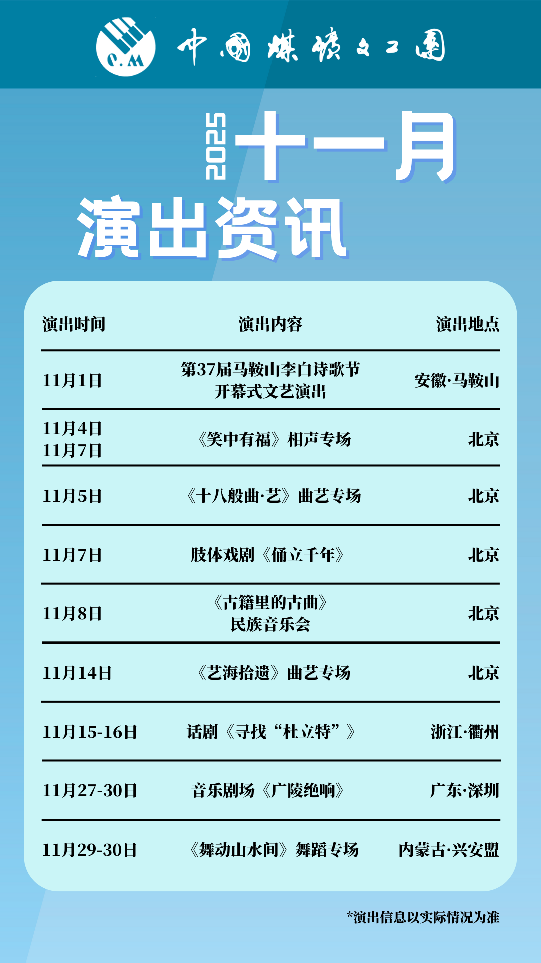 中國煤礦文工團十一月演出資訊